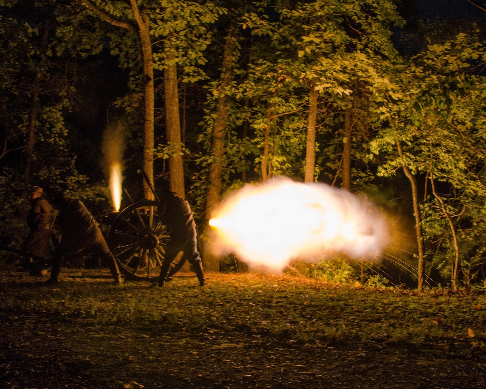 Night firing of a cannon is a really special event. The images have a totally different look and feel to them. For the night firings, I use tripod, because I am also using longer shutter speeds. I have found around 2.5 seconds is good. The ball of flames acts as a flash would and will light up the cannon crew and part of the area around the cannon.